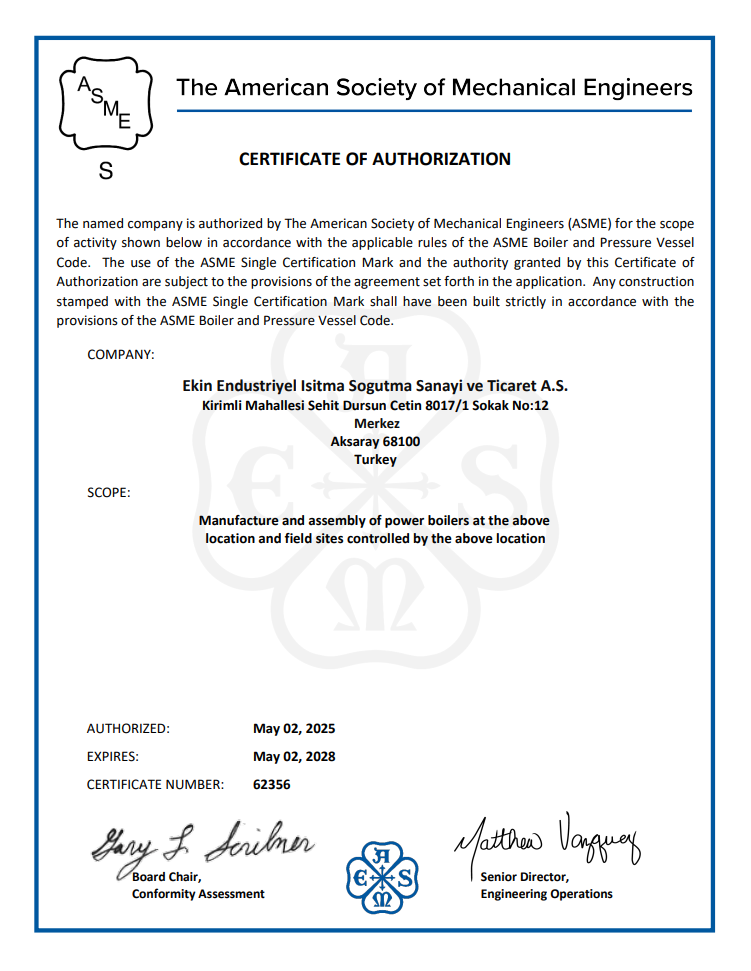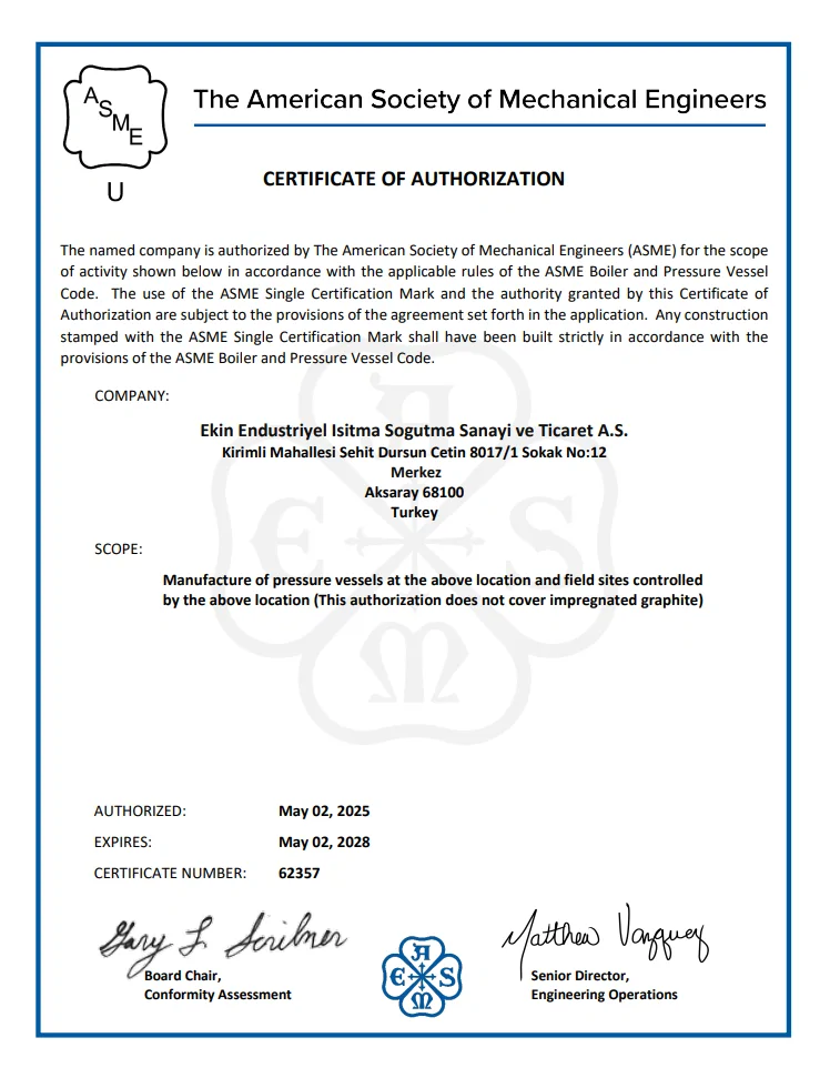 بفخر كـEkin Endüstriyel، نثبت مرة أخرى قدرتنا على التصنيع بمعايير الجودة العالمية والسلامة. اعتبارًا من مايو 2025، نحن مفخرة بتلقي شهادات ASME U-Stamp و ASME S-Stamp بنجاح، مدمجين هذه الوثائق الهامة ذات الصلاحية العالمية في نظام التصنيع الخاص بنا.