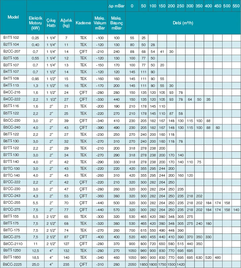 يُظهر الجدول أدناه التدفق الذي توفره أنواع النافثات الهوائية وفقًا لقوى المحرك المختلفة.